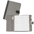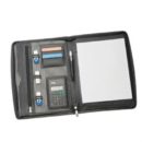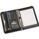Includes 25 page lined pad which insert from the top, solar calculator, internal pocket and zippered internal pocket, business card holders and pen loop. Pen not included.
